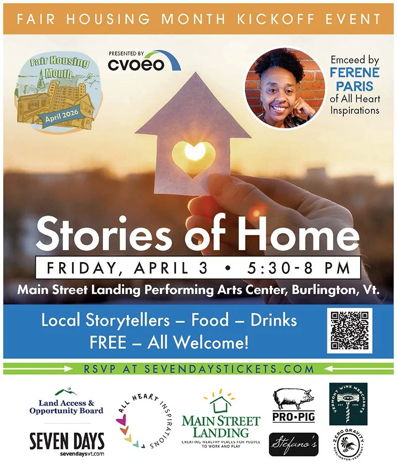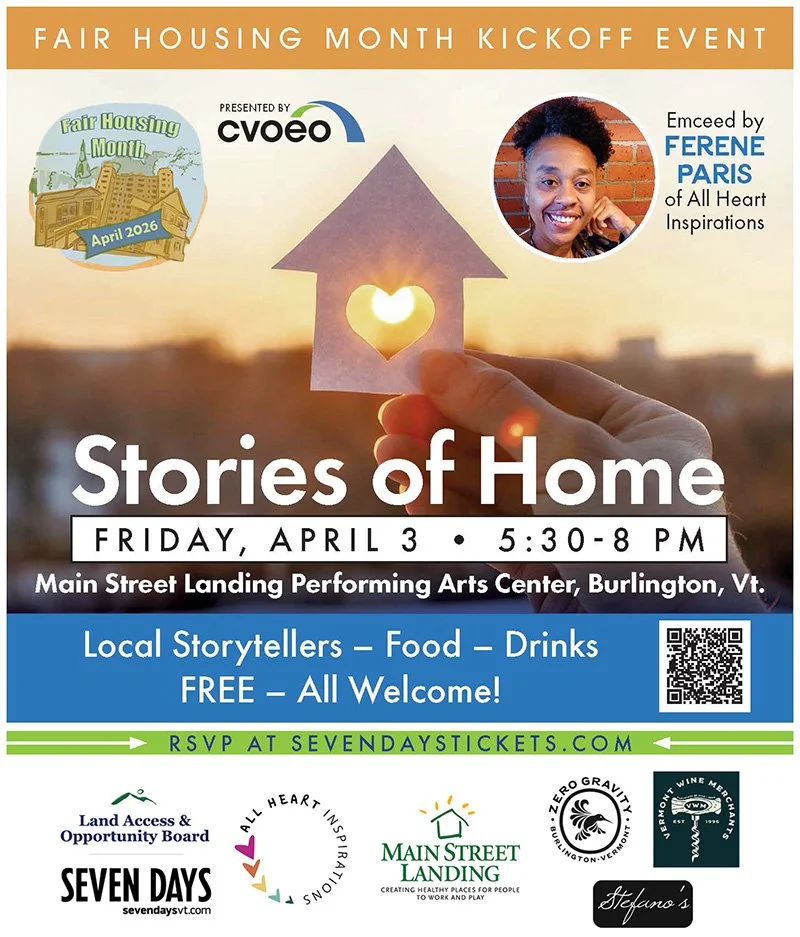 Each April the Fair Housing Project of CVOEO partners with housing providers, community organizations, libraries, and arts organizations across Vermont to honor the 1968 passage of the Fair Housing Act with education and outreach. We do this through public education series, neighborhood discussions, virtual panels and art events to raise awareness about housing discrimination in Vermont and the positive role that inclusive, affordable housing plays in thriving communities.