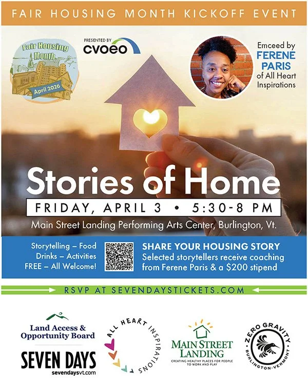Emceed by Ferene Paris of All Heart Inspirations, the first-person stories showcase hope, community, strength, and struggle while illustrating the realities and challenges of today’s housing landscape in Vermont. The celebratory evening includes hearty snacks and drinks, plenty of time and space for people to connect with each other, and opportunities to discuss housing issues and get creative.